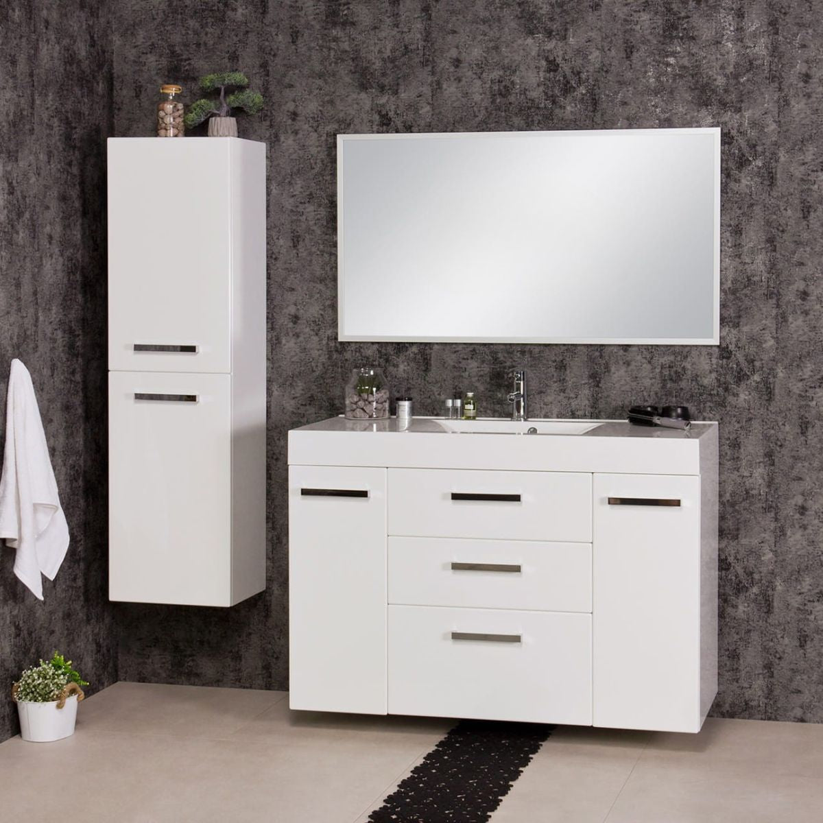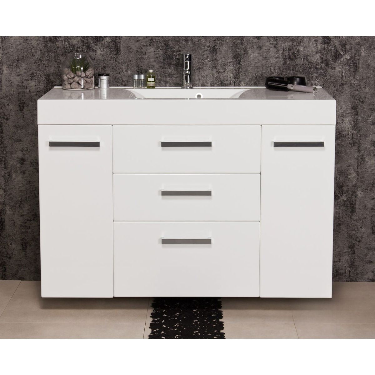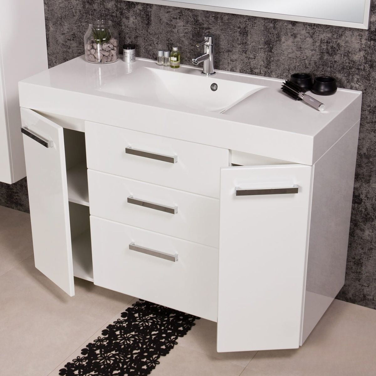 Spintelėje yra trys erdvūs stalčiai, kuriuose įrengta naujausia „Axis Pro“ slankiklių technologija, didinanti naudotojo komfortą. Stalčiai užsidaro lėtai, beveik tyliai. Vonios kambario spintelė pagaminta iš MDF plokštės, padengtos baldų plėvele, kuri apsaugo spintelę ir sukuria stulbinančią, lygią apdailą. Stačiakampis dolomito praustuvas sklandžiai dera su spintele, sukurdamas darnią visumą. Praustuvas turi skylę maišytuvui.