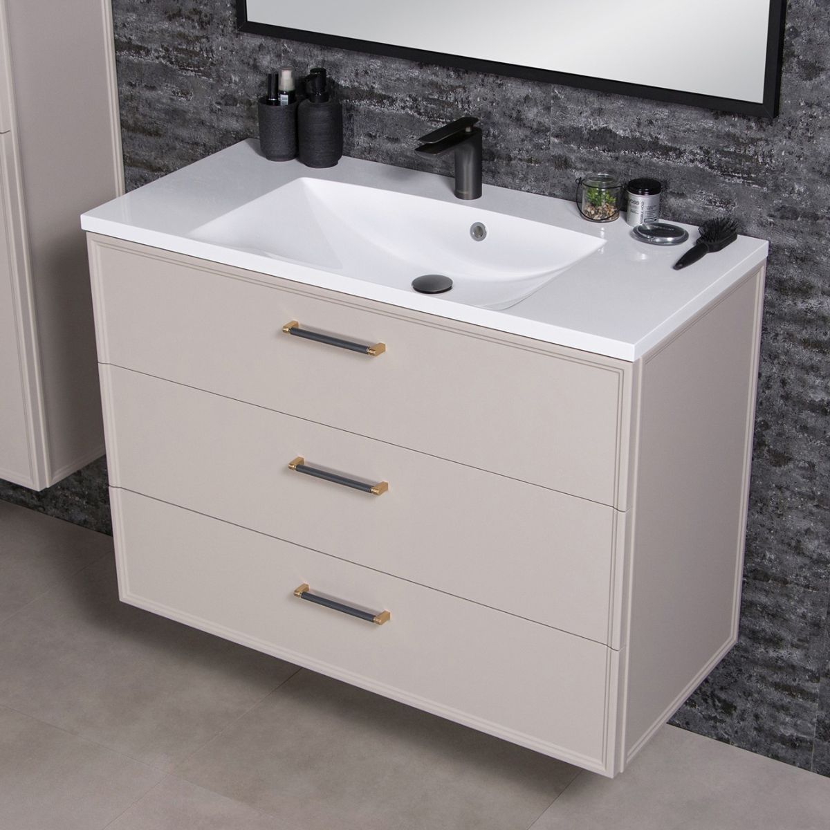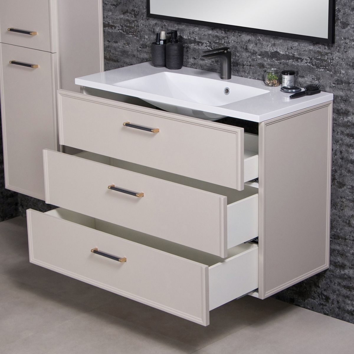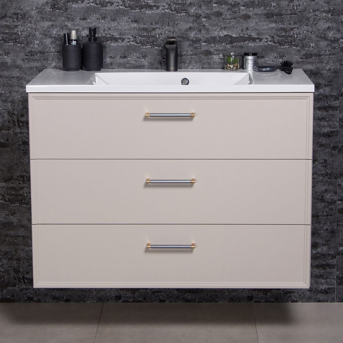 Ieškote išskirtinio stiliaus ir funkcionalumo derinio savo vonios kambariui? ANTE 100 cm kašmyro spalvos spintelė su praustuvu JULIA-1000C – tai elegantiškas pasirinkimas, skirtas tiems, kurie vertina kokybę, estetiką ir patogumą kasdien.
