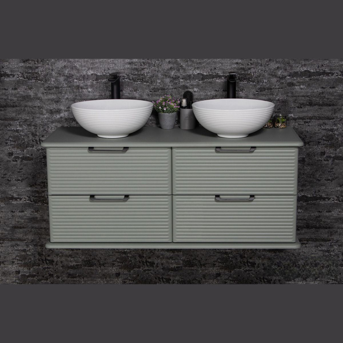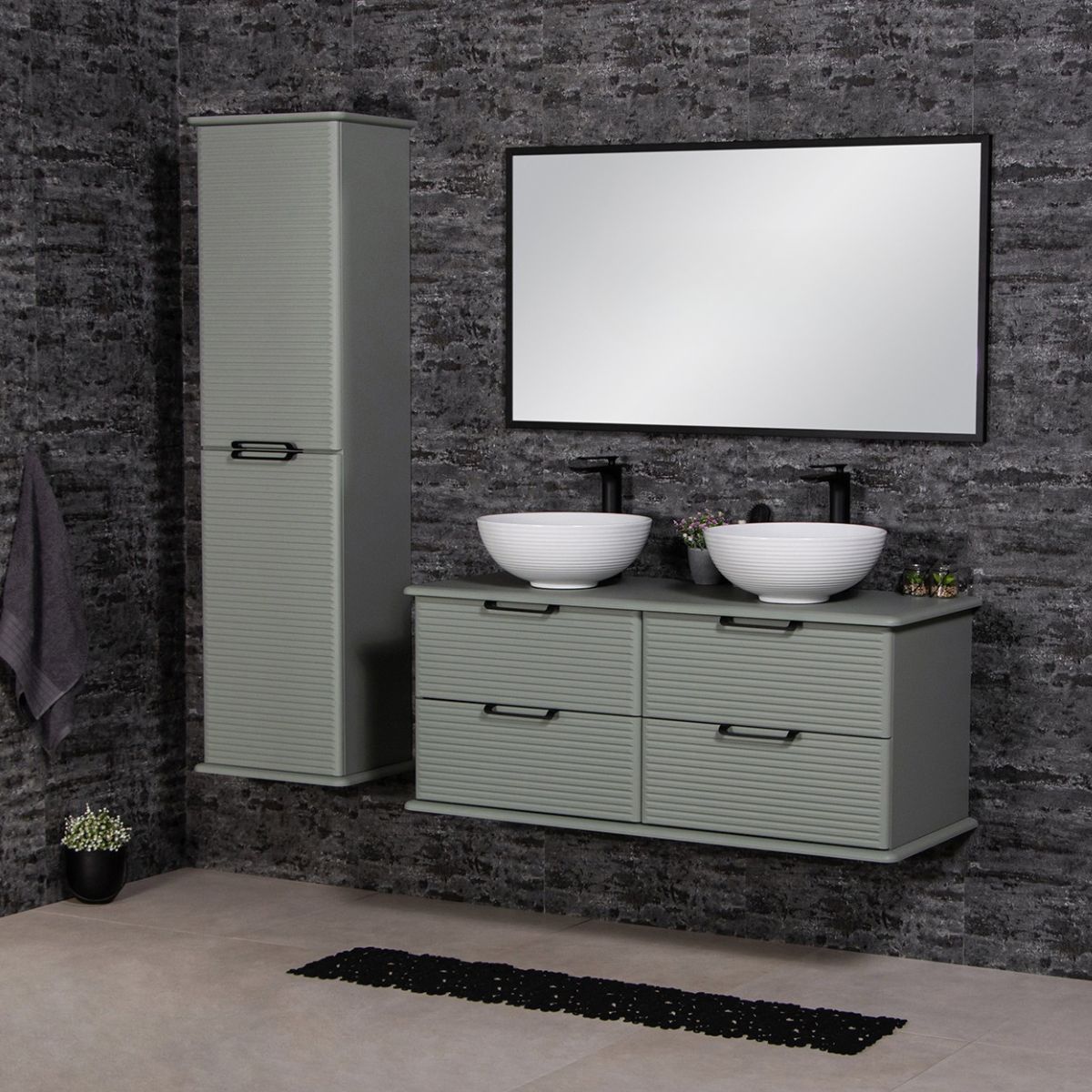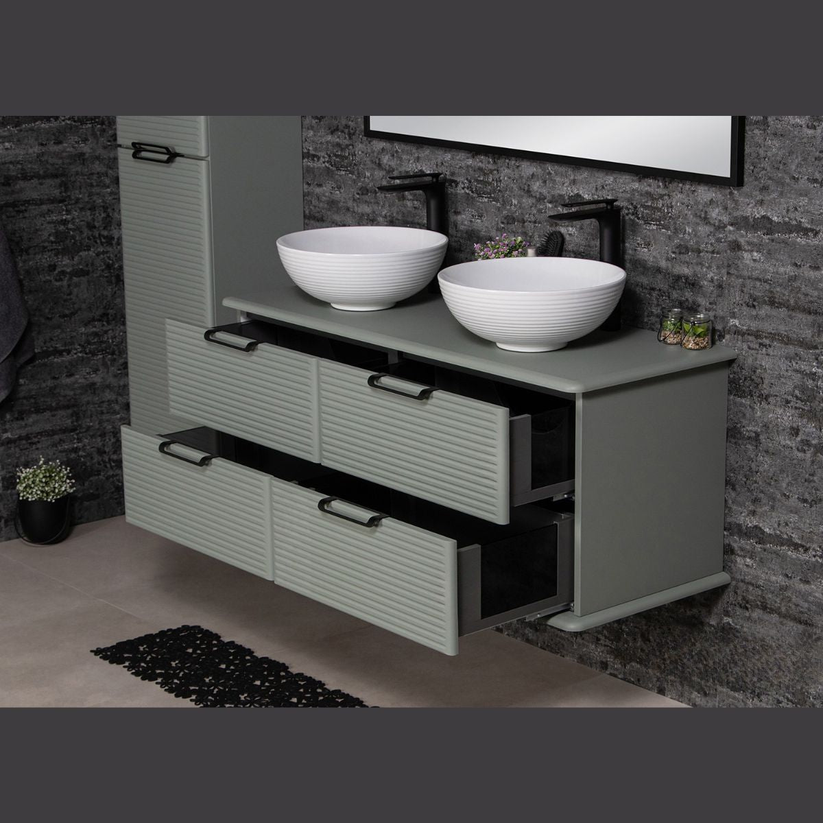 Ši 120 cm pločio „Libra“ kolekcijos praustuvo spintelė , elegantiško šalavijų atspalvio, derina rafinuotą dizainą ir aukštą funkcionalumą. Priekinės dalys puoštos horizontaliu grotelių raštu, o pailgas stalviršis ir apatinis kraštas su švelniai užapvalintais kraštais suteikia spintelei subtilios elegancijos. Dvi baltos keraminės kriauklės, įkvėptos spintelės frezavimo rašto, sukuria harmoningą ir įspūdingą kompoziciją, idealiai tinkančią didesniems vonios kambariams.