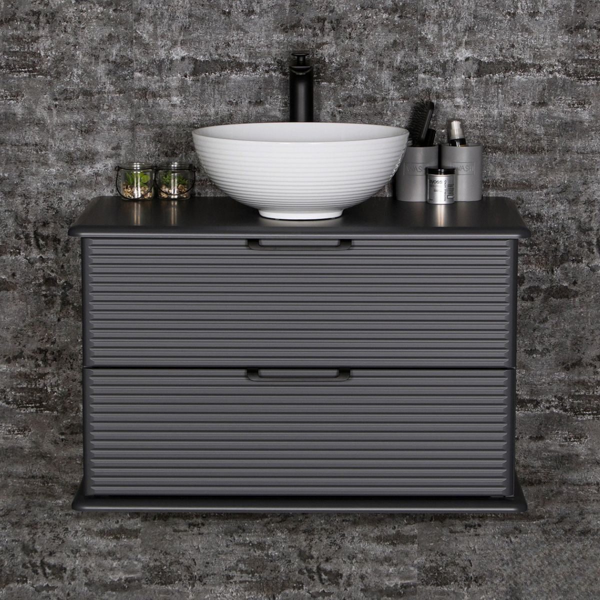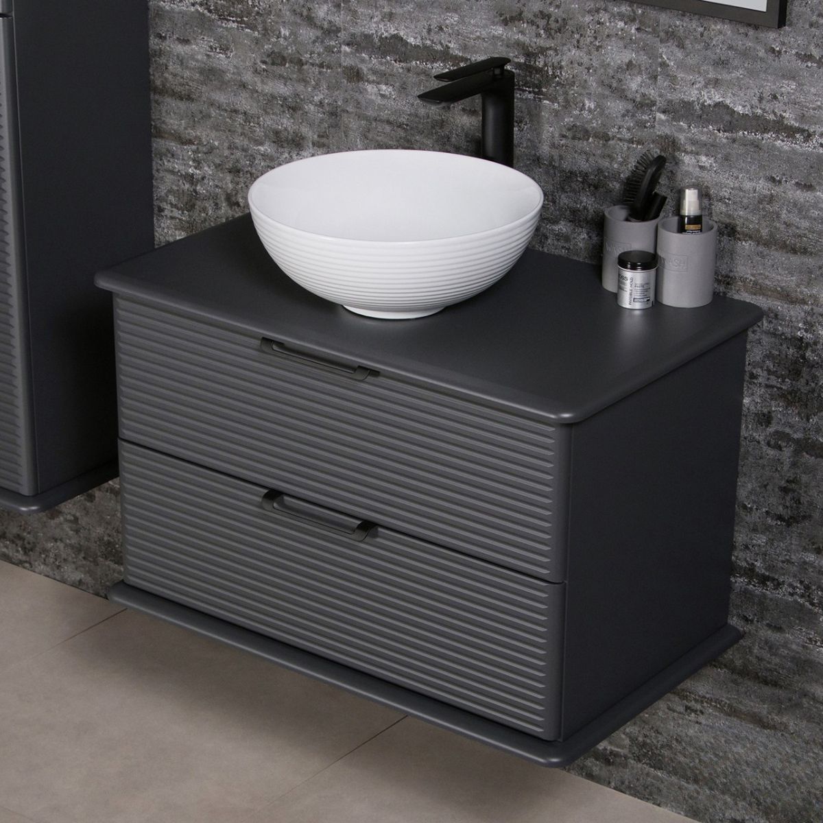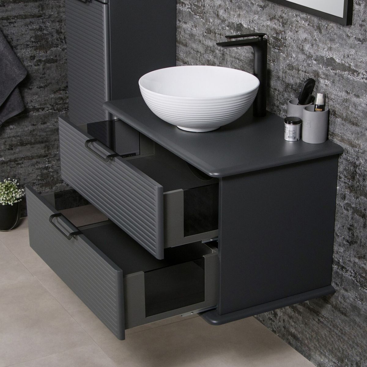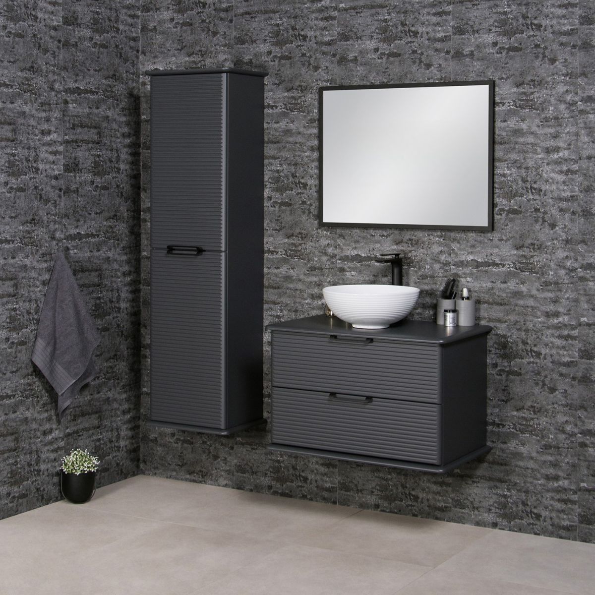 Matinės antracito spalvos „Libra“ vonios spintelė – tai modernaus dizaino ir elegantiškos apdailos derinys, skirtas stilingiems interjerams. Komplekte esantis baltas keraminis praustuvas atkartoja spintelės fasadų horizontalius griovelius, sukurdamas darnią ir vizualiai patrauklią visumą.