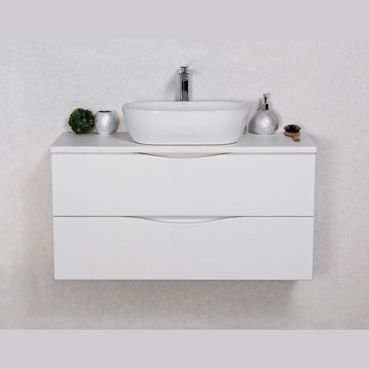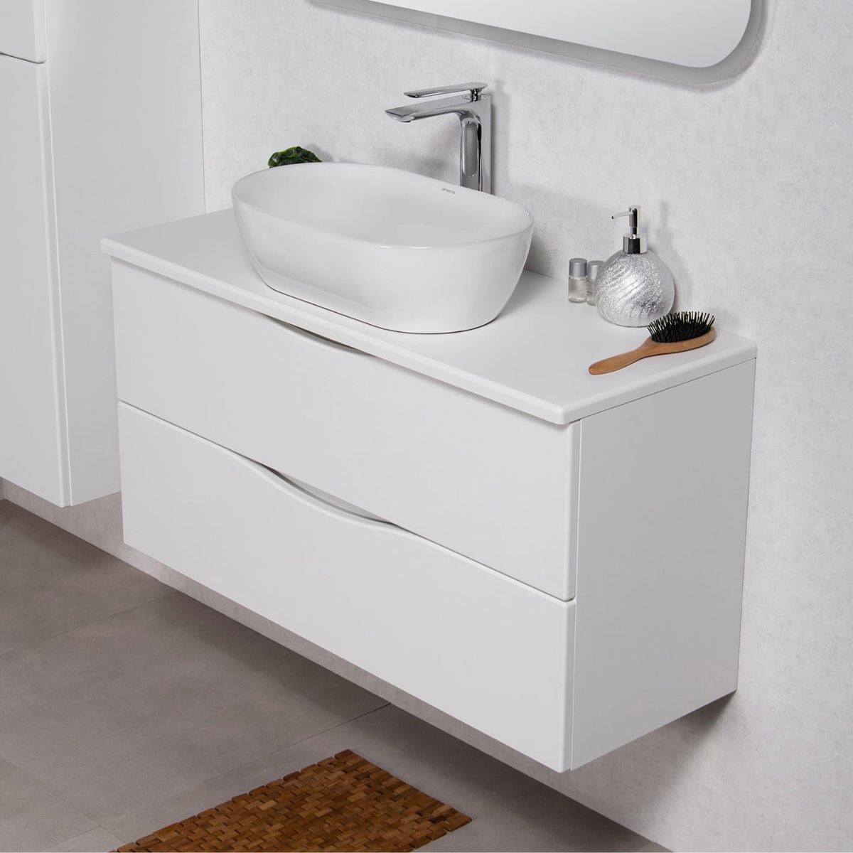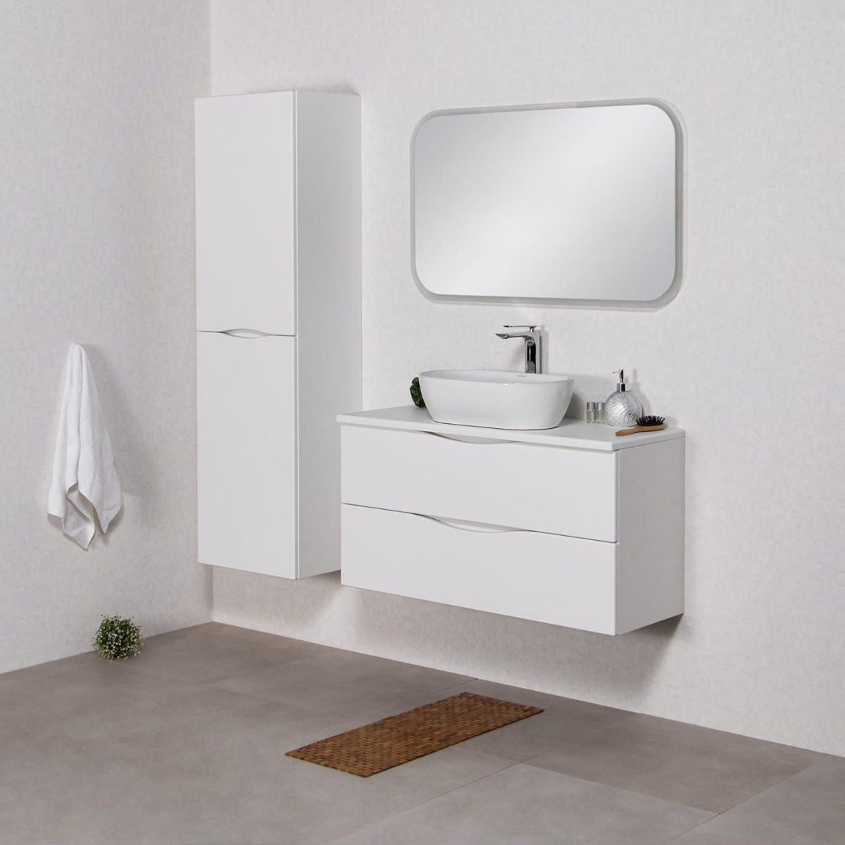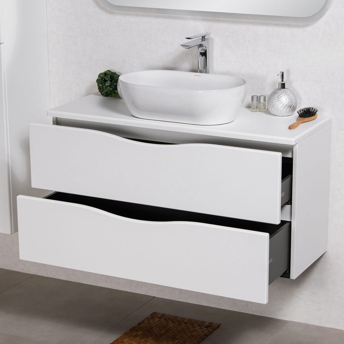 100 cm pločio vonios spintelė „Onda“ – stilingas ir praktiškas sprendimas erdviems vonios kambariams, kuriuose svarbus ir dizainas, ir komfortas. Matinė balta apdaila suteikia interjerui gaivų, raminantį charakterį, puikiai atitinkantį dabartines interjero dizaino tendencijas. Dizainas paremtas švariomis linijomis ir minimalistine forma. Stalčiai be išsikišusių rankenėlių turi griovelius, paslėptus fasadų kraštuose – subtilus, tačiau funkcionalus sprendimas, pabrėžiantis modernią spintelės estetiką.