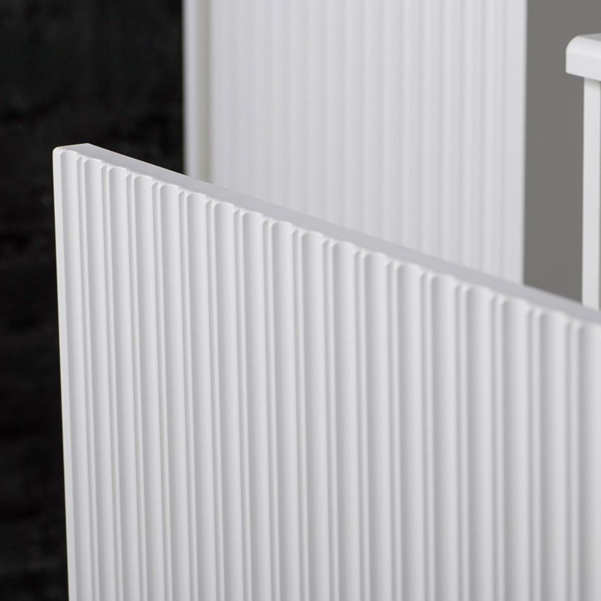 Matinės baltos spalvos pakabinama vonios spintelė su dviem baltomis kriauklėmis iš „Tretto“ serijos. Spintelės priekinę dalį puošia stilingos ir elegantiškos, vertikaliai ir simetriškai grioveliais išraižytos plokštės, suteikiančios spintelei išskirtinai modernų vaizdą. Modernumo ženklas – atidarymo sistema „spustelėjus“, leidžianti spintelės priekiui ir korpusui iš visų pusių sukurti tvarkingą, švarų paviršių.