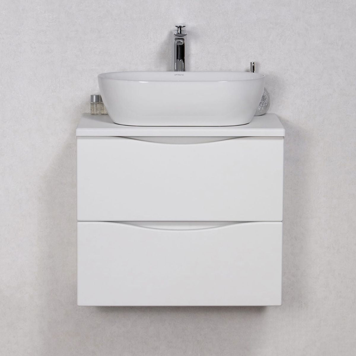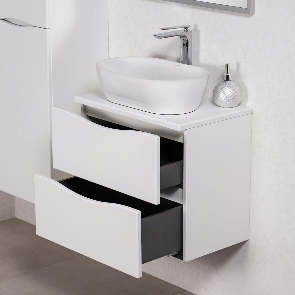 Komplektą sudaro keraminis, ant stalviršio montuojamas praustuvas, suteikiantis visam baldui modernumo. Stalviršyje nėra išpjovos maišytuvui ar skylės praustuvui, todėl galima pritaikyti įrangą ir praustuvo montavimą. Spintelė turi du erdvius stalčius su elegantišku antracito spalvos vidumi. Pakabinama konstrukcija suteikia dizainui lengvumo ir palengvina valymą po spintele. Spintelės korpusas pagamintas iš aukštos kokybės MDF plokštės, tiksliai padengtos patvaria baldų plėvele. Šis sprendimas užtikrina veiksmingą apsaugą nuo drėgmės – tai itin svarbu reiklioje vonios kambario aplinkoje.