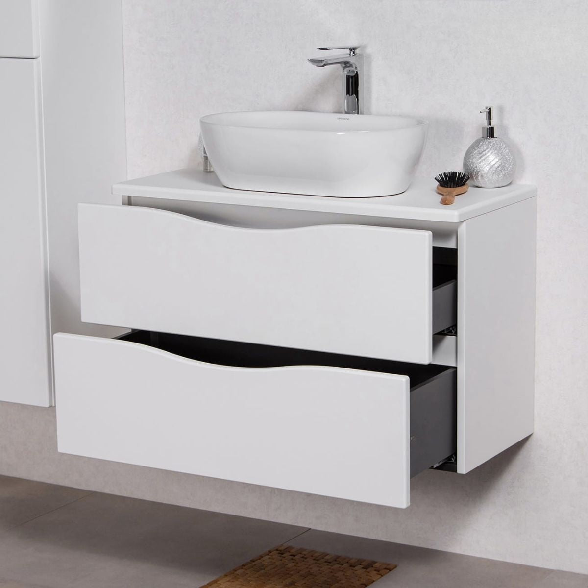 Ši 80 cm pločio vonios spintelė iš „Onda“ kolekcijos puikiai tinka tiems, kurie vertina modernų dizainą, funkcionalumą ir santūrų elegantiškumą. Jos paviršius padengtas subtiliu, matiniu baltu atspalviu, kuris puikiai dera tiek su šviesiu, tiek su tamsesniu vonios kambario dizainu, suteikdamas erdvei harmonijos ir gaivumo. Spintelės fasadams būdinga paprasta, geometrinė forma, be nereikalingų detalių. Aptakios, grioveliais išraižytos rankenėlės, integruotos į stalčių kraštus, sukurtos siekiant maksimalios estetikos ir patogaus naudojimo. Subtilios linijos ir rafinuotos detalės pabrėžia minimalistinį spintelės charakterį.
