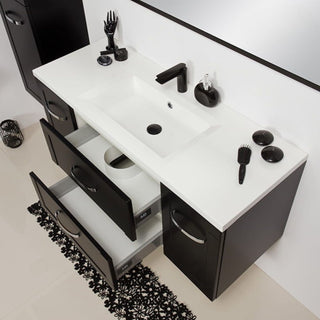 Išskirtinė matinės juodos spalvos spintelė ir balto dolomito praustuvas, kurių matmenys 50 x 121 x 46 cm. Spintelė dekoruota dailiomis chromuotomis rankenomis, suteikia jai šiuolaikišką ir elegantišką išvaizdą. Jame yra du stalčiai ir dvi durys su tylaus užsidarymo sistema , kurios dėka stalčiai ir durelės sulėtėja paskutinėje uždarymo fazėje ir užsidaro beveik tyliai.