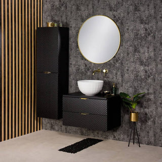 Siauriausios iš Glow serijos vonios spintelių yra 80 centimetrų pločio. Šiame variante panaudotos subtilios auksinės spalvos rankenos, kurios sulaužo iš grūdinto stiklo fasadų spalvas ir suteikia visumai išskirtinio, itin modernaus charakterio. Dėl nedidelio pločio tai bus puikus baldas mažam vonios kambariui, o gilaus stalviršio praustuvo naudojimas leido efektyviai išnaudoti erdvę spintelės viduje, o tai palengvins sutvarkymą. Pats praustuvas pagamintas iš balto dolomito su įdomiu raštu ir puikiai papildo stilistinę Glow serijos koncepciją.